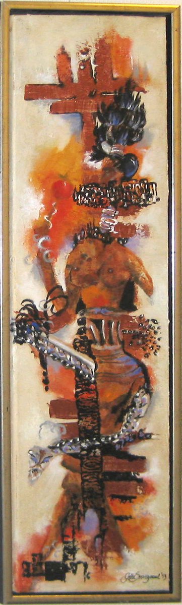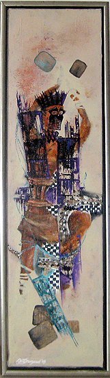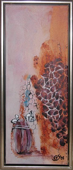 Nærbillede af 30 vendbare mini malerier i ramme på display, akryl.
